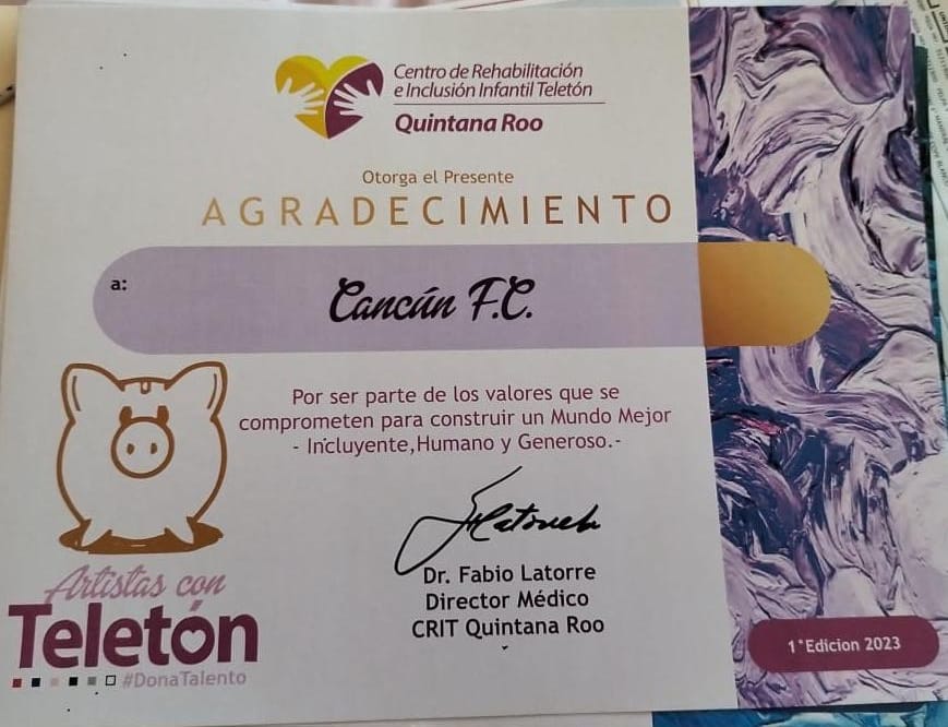 Cancún, Q. Roo.- Cancún FC fue patrocinador de la iniciativa “Donar su Talento”, impulsada por Colectivo “X la Pinta” a favor del Centro de Rehabilitación e Inclusión Infantil Teletón (CRIT).