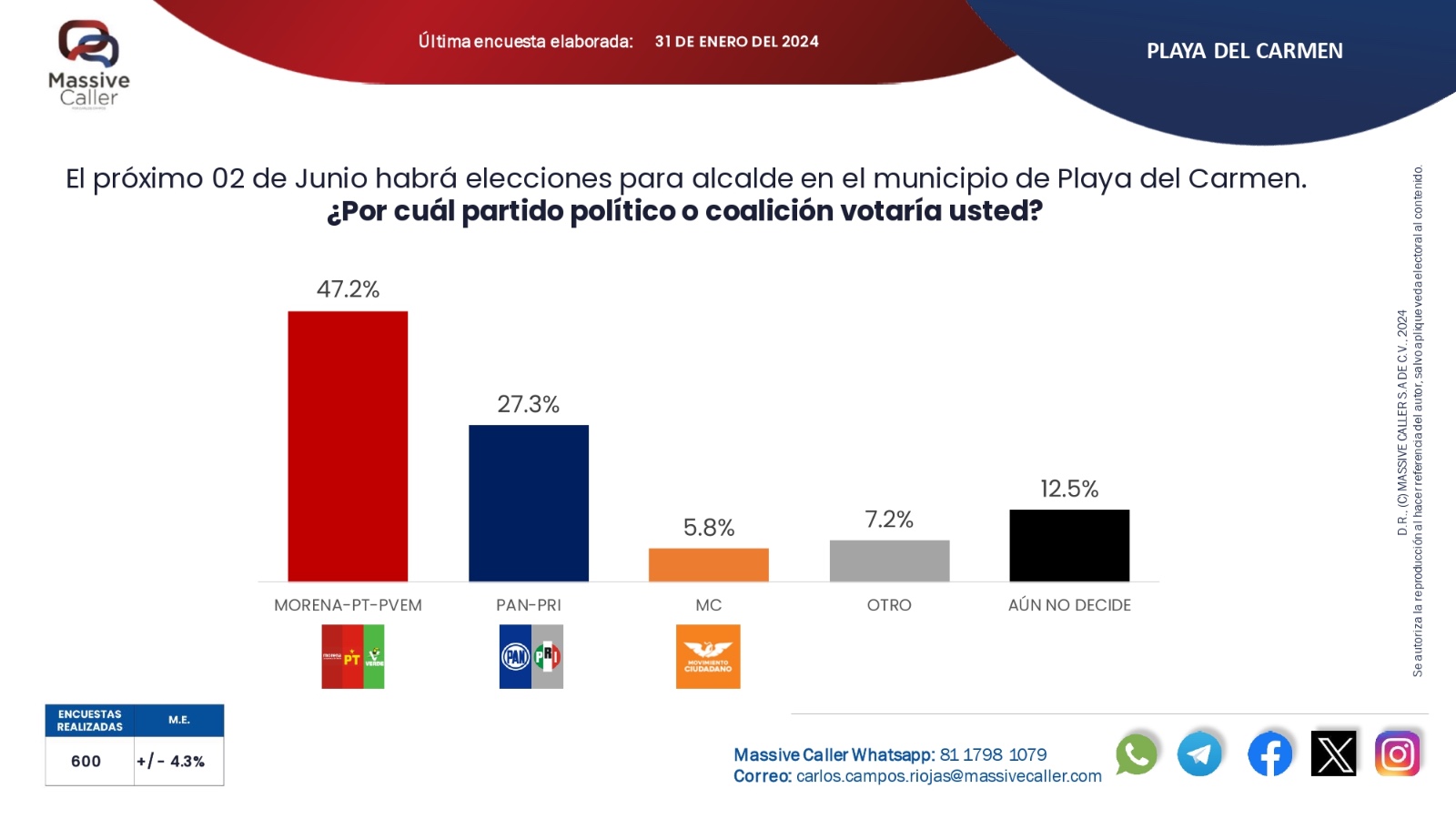 La encuesta de Massive Caller publicada este día y realizada el último de enero pasado, confirma también que Solidaridad es territorio de Morena donde el partido, en alianza con el PT y Verde sigue firme con 47.2 puntos en el primer lugar, muy por encima de los 27.3 puntos porcentuales del PAN-PRI.