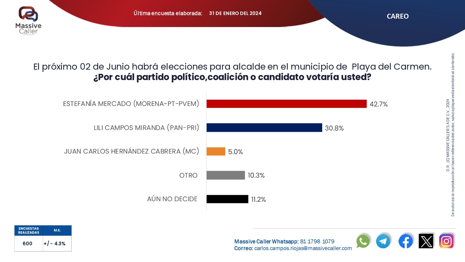 Playa del Carmen, Q. Roo.— Estefanía Mercado continúa firme en la intención del voto para la alcaldía 2024 del municipio de Solidaridad con 42.7 puntos porcentuales, de acuerdo con la última encuesta de Massive Caller.